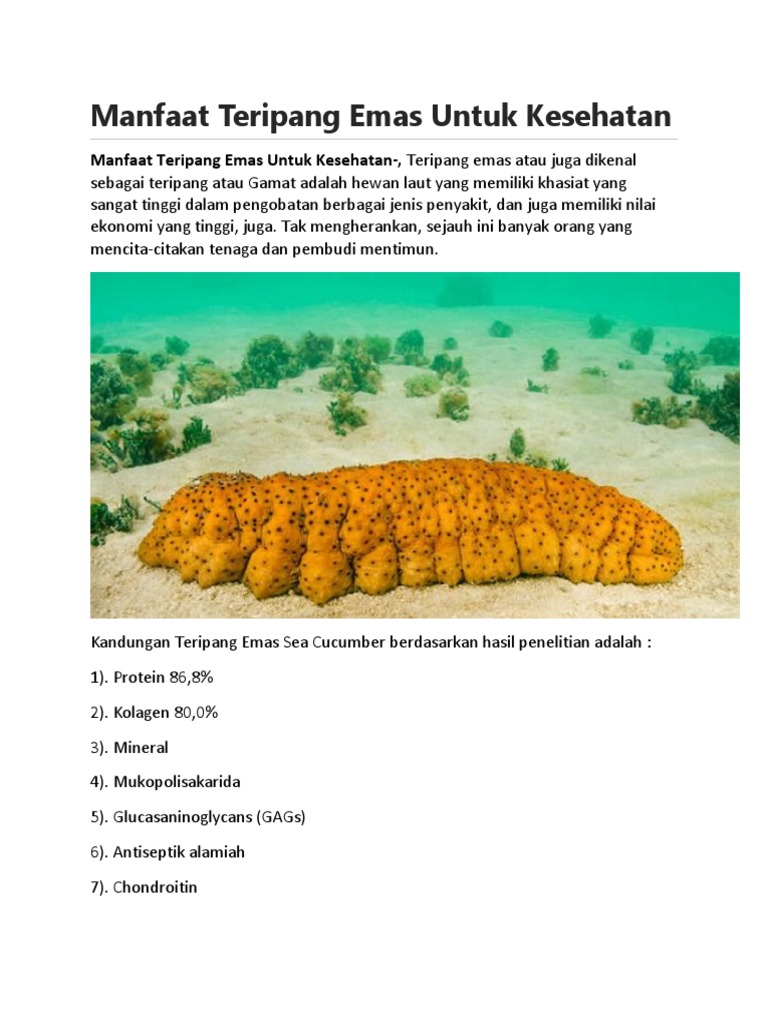 Teripang ternyata juga terbukti untuk mengurangi rasa sakit akibat peradangan dan menjaga agar peradangan tidak lebih buruk. .manfaatnya dan sifat dari biota laut yang akan dibahas dengan lengkap dan mudah dipahami. Tidak hanya enak, pisang juga memiliki sejumlah manfaat yang baik untuk kesehatan. Tanaman obat atau yang biasa kita sebut tanaman herbal sangat banyak sekali jenisnya dan manfaatnya, dari mulai mampu mengobati penyakit kelas ringan bahkan penyakit sampai ke penyakit kelas berat. Siapa sangka ternyata emas banyak sekali manfaatnya dalam kehidupan. Cara mengolah dan mengkonsumsinya adalah sebagai berikut: Teripang bisa dikonsumsi dalam keadaan segar maupun dikeringkan sebagai bahan dalam masakan. Secara modern, tubuh teripang diolah dan dikemas menjadi tablet di asia dan amerika sebagai nutrisi untuk membantu menangani gangguan psikologis. Teripang sekarang sudah banyak dibudidayakan dan dimanfaatkan sebagai obat herbal yang dapat menyembuhkan beberapa macam penyakit.